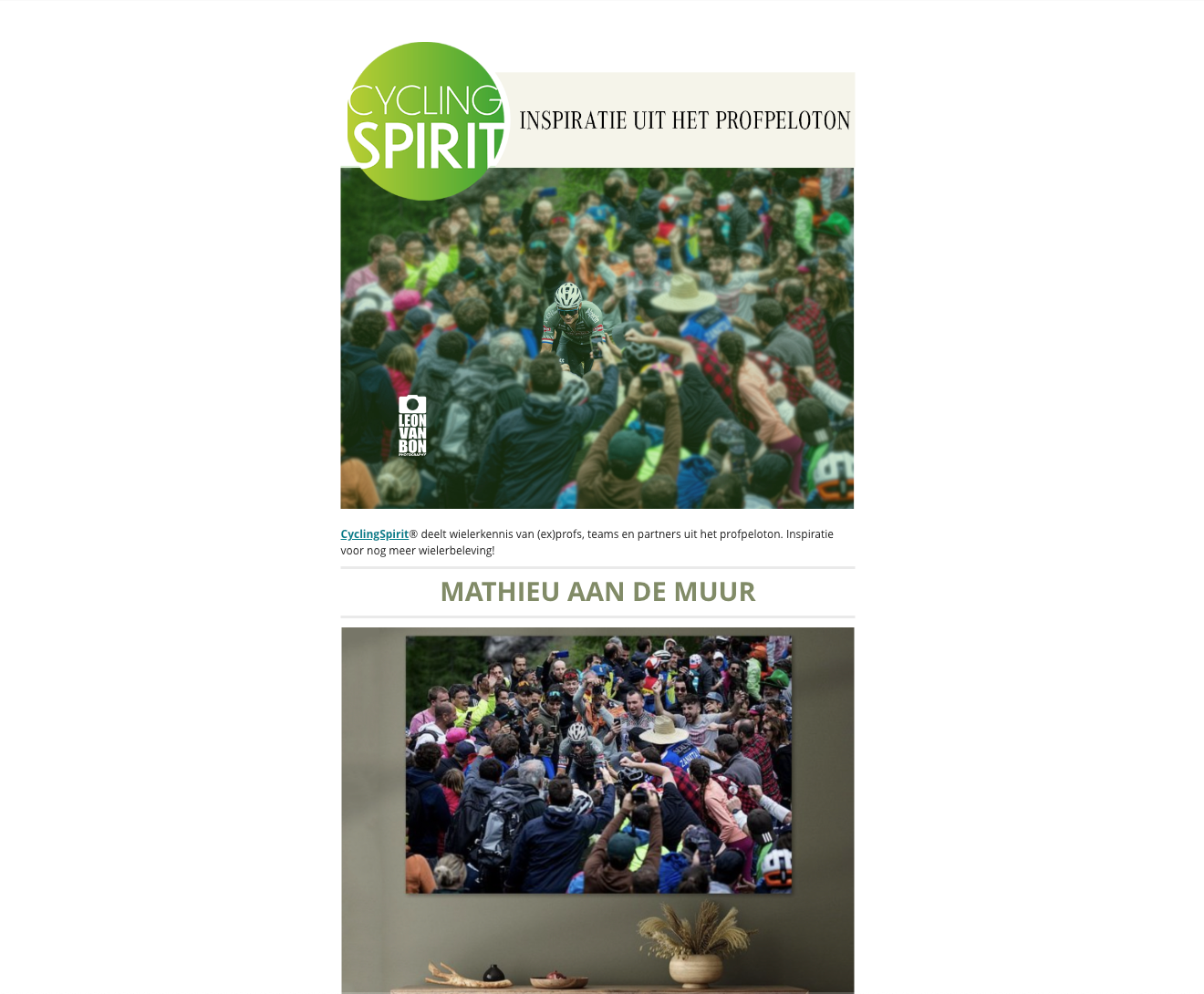 In samenwerking met CyclingSpirit worden in de wielermaanden geregeld nieuwsbrieven gemaakt en verzonden. Met inspiratie uit het profpeloton; om wielren-Nederland te enthousiasmeren over mooie evenementen, toffe producten en leerzame clinic's.